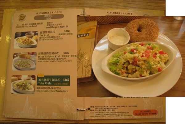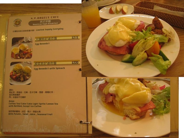 在菜單上選了「雞蛋生菜沙拉」搭配芝麻Bagel和「火腿班尼迪克蛋」,N.Y.BAGELS CAFÉ的「雞蛋生菜沙拉」是切成細丁的番茄、生菜、水N.Y.BAGELS CAFÉ的煮蛋及玉米粒,鄉村醬醬汁很不濃稠、味道不濃郁,雖不至於不好吃但卻令我感到不太習慣,我抹了附送的奶油醬塗在N.Y.BAGELS CAFÉ上再鋪上沙拉,Bagel的芝麻味很香,但是口感的飽滿度上略嫌不足,我ㄧ口一口咬著,小阿姨家的廚房彷彿歷歷在目,我還記得有一天早上小阿姨從長長的透明塑膠袋中拿出bagel,掉了一地芝麻,小姨丈一邊撿拾一邊和她鬥嘴的對話。