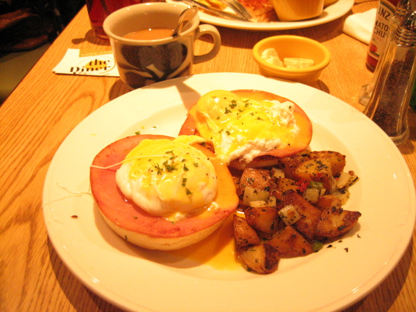 而「火腿班尼迪克蛋」是曾經在瑞安街「樂子」吃過的菜色,「樂子」做這道菜不甚突出,令人印象深刻的是最下層的英式muffin竟然和麥當當的滿福堡麵包相差無幾,但N.Y.BAGELS CAFÉ做的「火腿班尼迪克蛋」好多了,配菜除了馬鈴薯塊還有新鮮的番茄生菜,N.Y.BAGELS CAFÉ的荷蘭醬汁較樂子不黏稠但是香味不減,水波蛋一切開,蛋汁鼓鼓流出,看了立即胃口大開,最下頭的英式muffin吃起來如熟悉的scone鬆彈綿密口感,和水煮蛋白、火腿片沾著與和合蛋汁的荷蘭醬一起吃,真是美味極了,略為可惜的是陪襯的馬鈴薯塊只有熱油煎過的油香和一點點焦香,如果能加點香草細末,不曉得該有多好!