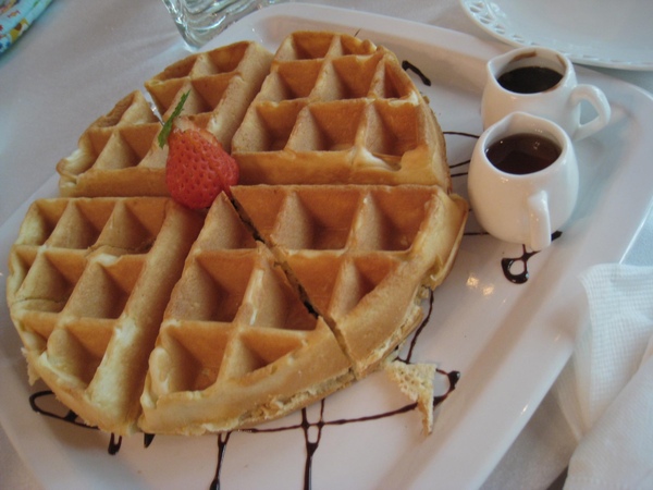 同事點的鬆餅附有巧克力醬和蜂蜜醬