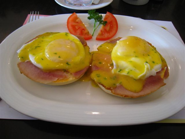 那天我先到安德魯餅店去買了一個蛋撻,咬了一口以後發現是涼的心裡有些失望,因為話說我本來不是蛋塔愛好者,吃完了沒有什麼太大的感覺,走到鄰近的咖啡店後發現幾乎客滿,於是先到十月初五馬路,閒晃到盡頭後折回也差不多是該用午餐的時間,發現安德魯咖啡裡有個不錯的位置,推門進去看了菜單,然後不曉得哪根筋不對勁硬是要選店內小黑板上寫餐點,最便宜的是澳幣35元的班狄尼克蛋,安德魯咖啡的班狄尼克蛋沒有什麼好被批評的,而吃完以後肚子真的很飽足了,只是我放眼望去每一桌的沙拉和餐點看起來都比我的豐富美味多了,我真想偷拍那些看起來好好吃的餐。