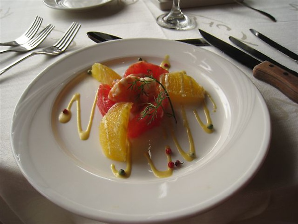 鮮蝦口感很好而且水果超好吃的!特別的還有醬汁上的粉紅胡椒,辛香但不辣,是一種很特別的香料喔~