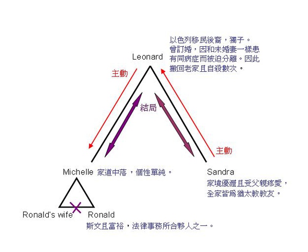 修得正果的是真情,相對的是癡情,「紐約愛情故事」裡沒有一個不癡情,Michelle和有婦之夫Ronald苦戀,頗有亡命心態的Leonard愛上Michelle甚至願意拋棄一切,Sandra為愛包容行為一直有些怪異的Leonard並且持續以含蓄手段追求。編劇心腸很好,最終讓Ronald離婚,證明了對Michelle的愛,也讓Leonard領悟愛情或許不應該是激情的相濡以沫而是應當和合適的對象一起;唯一的受害者只有自始至終未曾在電影中現身出聲的Ronald妻。