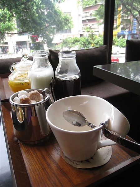 除了鬆餅,我們也沒有錯過飲料,婉婷點了水果茶,看起來超美的,但我們都覺得味道略嫌過酸,我個人還是喜歡口味酸甜的水果茶,至於我的咖啡歐蕾則很有趣,服務生將盤子端上桌的時候,我們都忍不住輕呼了起來,竟然是各一瓶冒著煙的咖啡和牛奶,且附上隔熱布和糖,杯子和湯匙的設計也很別緻,牛奶可以續瓶一次,所以我就很順利的混合成喜歡的拿鐵,我喝拿鐵通常不加糖,但在「咖啡弄」從糖罐裡夾一小方糖進咖啡裡攪拌,喝在嘴裡微甜,同時也開心了起來!