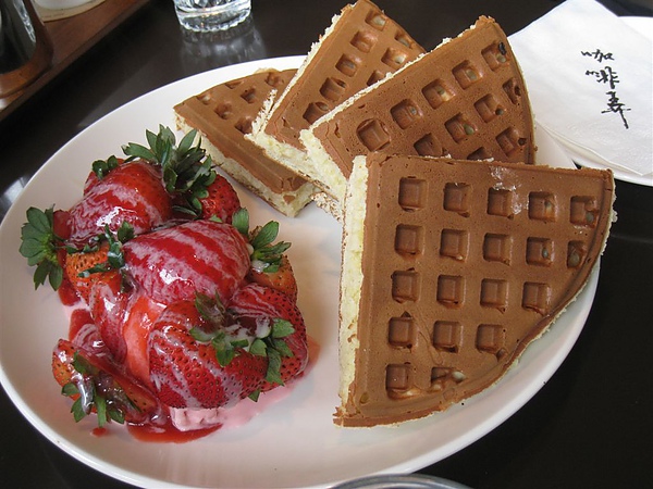其實我家也有鬆餅機,我弟心血來潮的時候會買日清鬆餅粉做給大家吃,但是坦白說,我一直沒有超愛吃鬆餅,甚至可以說有點不明白為什麼鬆餅會走紅,吃過「咖啡弄」後才恍然大悟:原來鬆餅的美味取決於厚度!「咖啡弄」的鬆餅很厚實,口感上鬆軟富有彈性,而且盛盤後,即使冷卻了,口感也不變,但是一般鬆餅機製作的鬆餅厚度不夠,往往很容易受溼氣影響,失去彈性且變得軟韌!