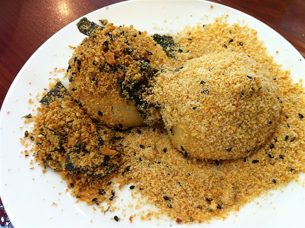 至於大家去双連O仔湯的燒麻糬,我記得好像是高中同學啃布帶我去寧夏夜市吃的,後來好幾年,無論我去寧夏夜市吃了多少東西,最後一定要在圓環附近那一攤吃完一份燒麻糬收口。双連O仔湯的燒麻糬有鹹有甜,吃慣甜口味的我第一次嘗試裹素海苔肉鬆的鹹口味其實不甚喜歡,但這小點心也很奇妙,不那麼討我喜歡卻留下深刻的印象,後來去双連O仔湯,也總是要來一份「甜鹹各一」的燒麻糬。食物總是這樣的:承載著記憶,記憶儲存著往事,而往事鑲嵌著情感,年紀越長,有時候吃食也是一種紀念的方式。
