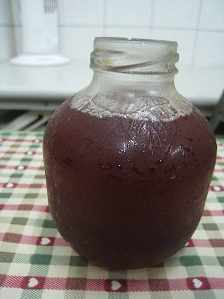 老闆娘說外帶杯用完了,於是酸梅汁裝在這樣的玻璃瓶裡,這樣非餐館式的作法讓我覺得好像是到老闆夫婦家裡作客,他們像是把平日吃喝的東西都搬出來說明和招待~