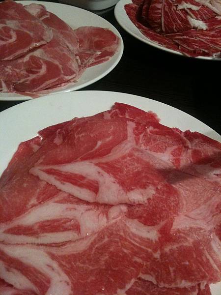 最下面的羊肉,左邊是梅花豬,右上是牛小排,我偏好後兩者,豬肉片涮白鍋後單沾水果醋口感很好而且去油解膩,牛肉片涮辣鍋香辣夠味,這樣的方式讓我一個人就可以吃整盤~