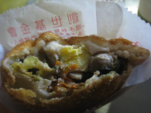 我最近去寧夏夜市發現攤商搭起超大頂篷,如此一來就算下雨也依然可以吃吃喝喝喲!這次除了例行性必吃的「林記麻辣臭豆腐」以外,新體驗了很值得推薦三項美食!第一是耶誕夜和大學同學兔子去的時候她買過的蚵仔包。蚵仔包的豐富和常見的蚵嗲大大有別,老闆使用的蚵仔新鮮飽滿,炸過蚵仔包皮薄料多、外酥餡軟,熱騰騰咬下,絞肉、香菇絲和雞蛋味道清新,免沾醬就很好吃囉!但是蛋黃炸熟的熟度不一,有的可能逼近全熟,但也有會流淌蛋黃稠汁液的情況。