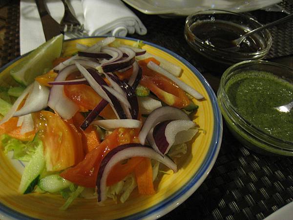 印度料理的香料味道濃重且富有層次,除了鹽酥蝦使用非鮮蝦失去真口味和彈跳口感以外,其他當日點選的餐點都很棒,我十分喜歡番茄湯,而且搭配生菜香料沙拉一起吃,清爽開胃,生菜香料沙拉的蔬果都很爽脆,除了擠淋檸檬片汁液,還可以沾取附上的菠菜醬或梅子醋醬,讓口味更加豐富。