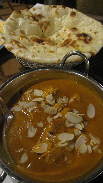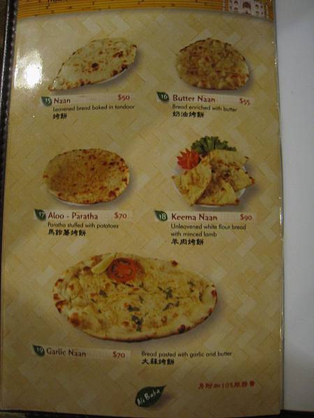 至於特級雞肉咖哩則因為使用的是雞胸肉,而且口感略柴,也許下回嘗試看看特級羊肉咖哩,而且服務生說每種咖哩的醬料配方是不同的,下回也可以搭配其他種類的烤餅,因為「阿里巴巴的廚房」提供的烤餅價格還比百貨公司美食街實惠,一張切成四片的奶油烤餅五十五元,彈性和味道都很好,這種印度稱為「Naan」的餅是有一點點彈性的,我對羊肉烤餅和馬鈴薯烤餅也都很好奇。