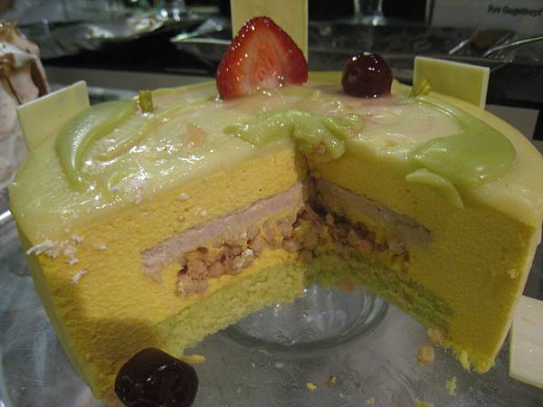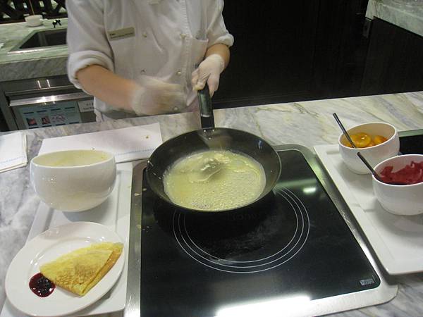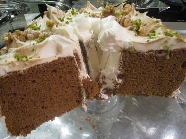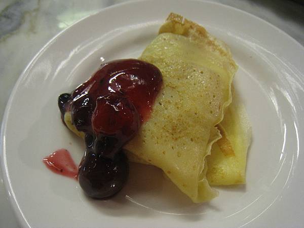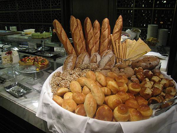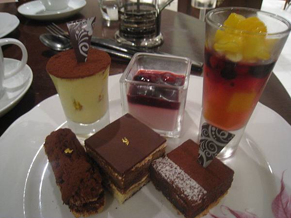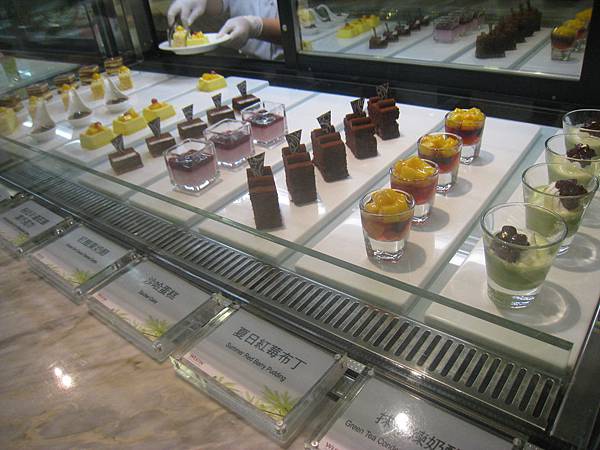 我以前很自豪於超能吃這種吃到飽的餐廳,但這回原來慣有的飲食技巧打開始就亂了套,先是服務生送上熱騰騰的燒烤大明蝦又提醒說要趁熱吃,然後我急急慌慌搶先吃喝了白酒蛤俐和蕃茄蔬菜湯,而非先從清淡的沙拉開始再緩緩地喝湯,中間還一度取用了一些烹飪得過柴的肉排類食物,卻全吃光光,再去印度區吃了好喜歡的烤餅和印度式炒飯,當然很快就飽了,最後再度失策前後取用法式薄餅、烤布丁和味道超濃郁的巧克力類甜點,肚皮整個非常非常撐哩!簡直沒有容納冰淇淋的地方了,更遑論那些看起來好精美的蛋糕!