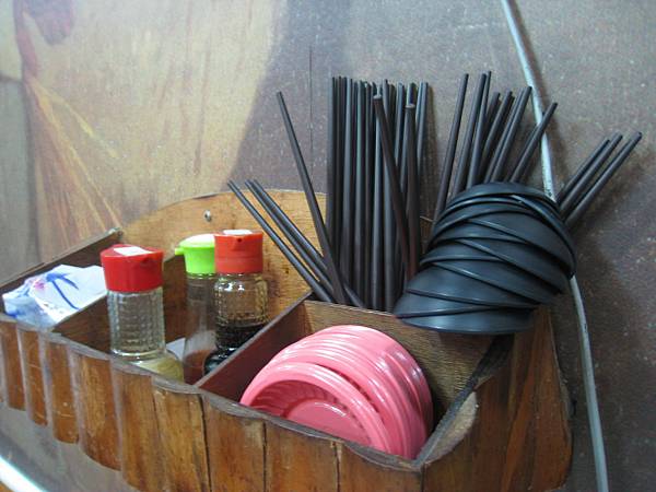 我想「牛棚」生意興隆又長久,應該是因為實在,連器皿都是厚敦敦的陶燒質地,重量不輕卻稍具保溫效果,而且香油、白醋、醬油和酸菜等佐料一應俱全,可見老闆的個性很實事求是,如果說有什麼需要改善的,就是那些佐料的瓶瓶罐罐若能摸起來乾淨清爽些,肯定舒適多了!