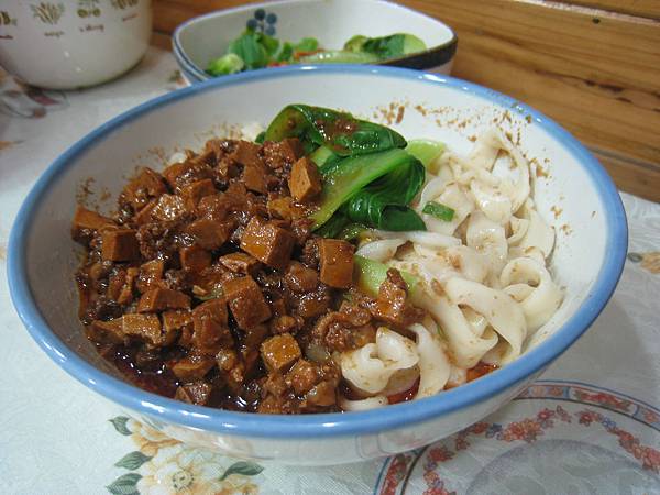 每次到「牛棚」,我幾乎都要點水餃和蛋花湯,水餃的形狀很有型,麵皮不是薄的,是富有彈性且恰到好處的厚度,內餡飽滿又香,一顆要價5元,比連鎖店的鍋貼美味許多;而蛋花湯最棒之處是蛋花是難得的厚綿香嫩,而且不加蔥段或蔥末,只有幾許青菜和紅蘿蔔絲,味道清雅,深得我心。以前也曾專程來品嘗牛肉麵,我對茄汁牛肉麵的湯頭印象比較深刻,喜歡自然樸實的果香酸味,而新近我嘗試了麻炸麵,也就是麻醬和炸醬混合的麵,選用的是較有嚼勁的刀切麵,整體味道頗不錯。