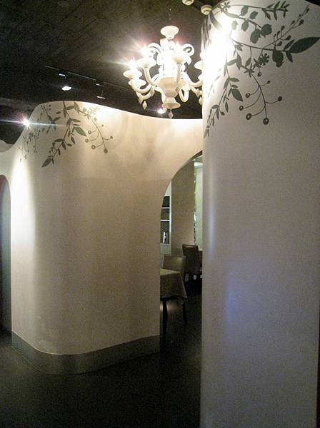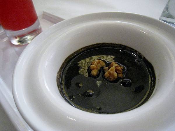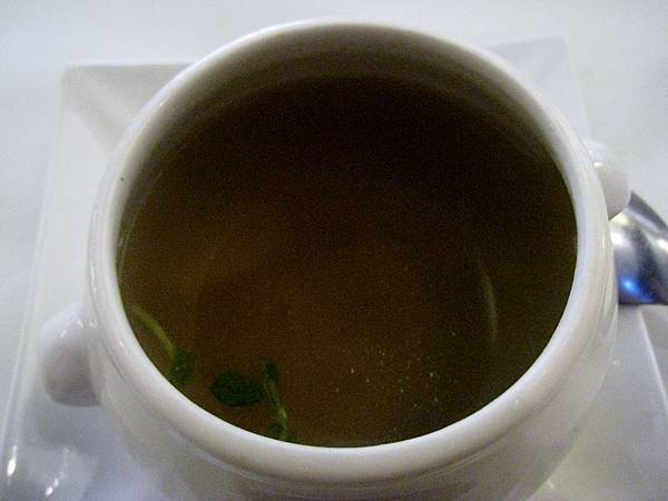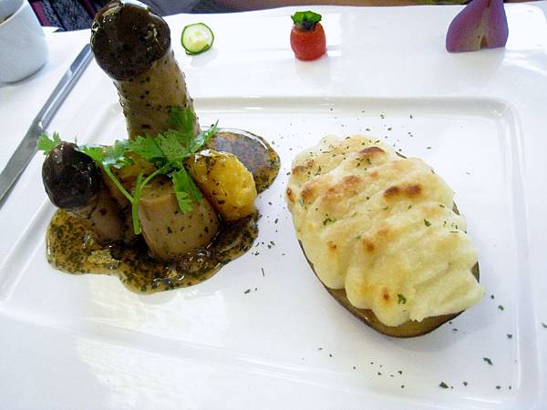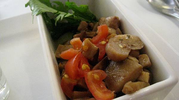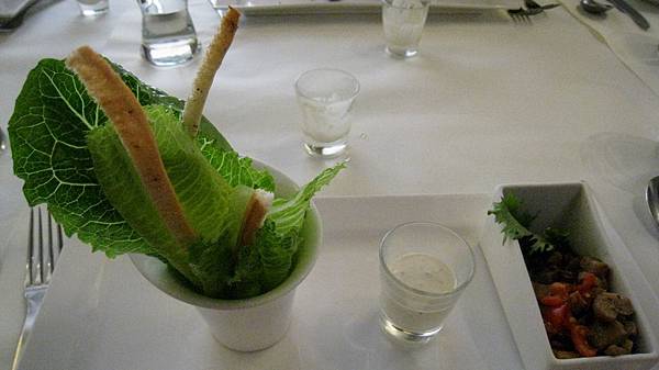 蘿美香蕈沙拉的右側菇類味道不錯,但左邊很是棘手,比較優雅又合乎禮儀的方式是將左邊那些生菜葉倒出來在餐盤上切開吃,偏偏方盤上的空間又不夠.....