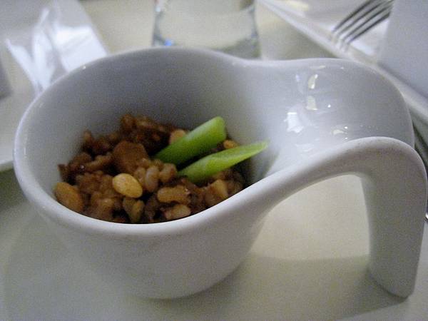 我當天因為好奇點用了青漾蕈菇濃湯,以香菇、洋菇、杏鮑菇搭配青豆泥熬煮而成的濃稠湯品,充滿青豆的特殊風味,服務生收盤時注意到殘餘份量,這是很多同等價位的餐廳不會注意到或不會主動處理的,但「舒果」的服務生不但主動詢問口味合適度和更換湯品的需求,即使我很不好意思地婉拒,她仍很客氣熱情地請我重新選用,最後我點用了牛蒡腰果清湯,湯頭甘醇,很好喝喔!