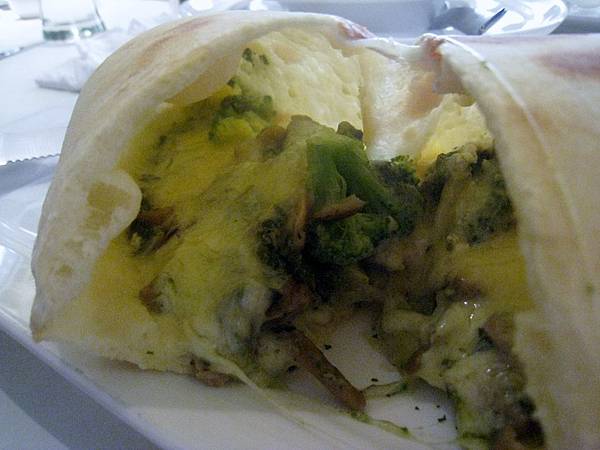 我點選的塔香鴻喜菇義大利麵口味相當清淡,很合乎我的期待,但也有口味口感都較渾厚的義大利麵料理:地中海杏鮑菇竹炭麵,醬汁香辣、麵條的彈性口感和香韻隨著咀嚼在齒頰間產生,牛肝菌義式辣椒麵的辣度又更增強了,可惜可能因為受限於香料種類的使用,層次稍嫌貧乏。彩蔬紅咖哩焗飯和卡洛佐尼枕頭披薩則讓我覺得很有趣,彩蔬紅咖哩焗飯實際賣相比菜單上的圖片還繽紛,而且米飯被調裡成方塊狀的,而卡洛佐尼枕頭披薩則是有些類似於在貝里尼吃過的披薩餃素食版,具有強大的飽足感,一般女生的食量恐怕難以單獨吃完。