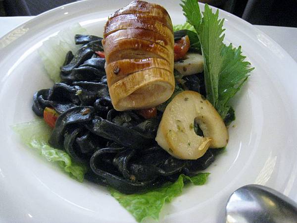 地中海杏鮑菇竹炭麵的杏鮑菇是仿魷魚狀,乍看之下覺得很有趣~
