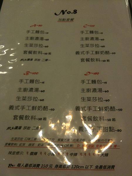 所以雖然「NO.8 Italian」設於巷弄中,雖然坪數不大,雖然裝潢很簡單,雖然菜單只是一本文件資料夾,情調沒得比拼,但飲食水準和貼心設想的細節都很難得,難怪可以在競爭激烈的商圈內立足,我真心期盼「NO.8 Italian」生意能夠越來越興隆,未來變成更棒的義大利餐廳!
