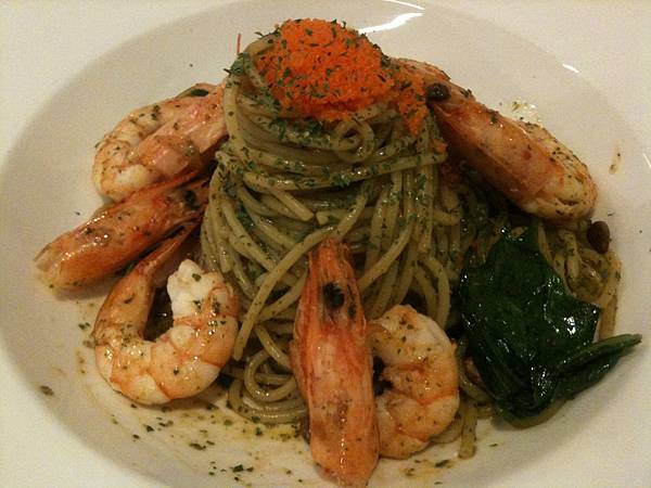 橄欖油香蒜辣椒松子青醬魚卵鮮蝦很特別~